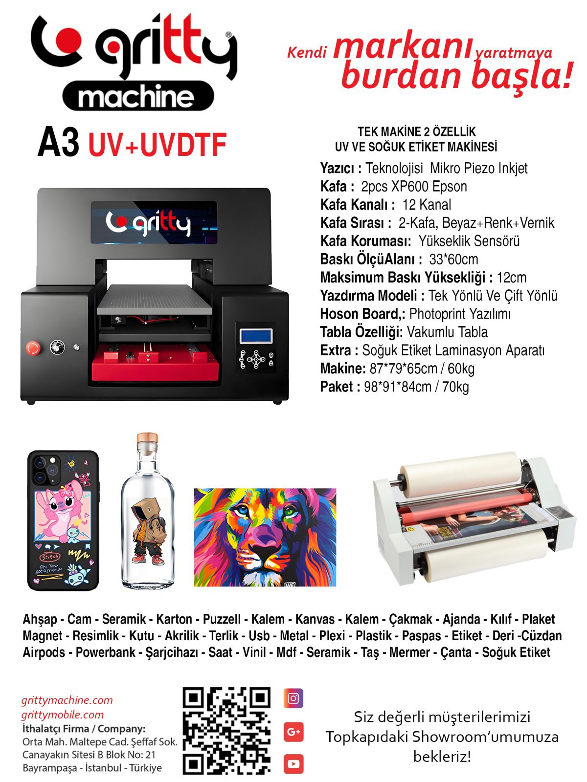 A3 UV + UV DTF baskı makinesi, tek makineyle maksimum üretim çeşitliliği sunan, modern ve kârlı bir dijital baskı çözümüdür. Kendi markasını oluşturmak, promosyon ve kişiye özel ürün pazarında yer almak isteyenler için güçlü bir yatırımdır.